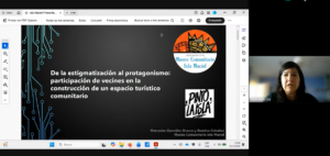 Por su parte, Mercedes González Bracco, junto a la vecina Romina, expuso cómo las prácticas de participación comunitaria en la Isla Maciel (Buenos Aires) contribuyen a la resignificación de territorios históricamente estigmatizados, mediante la construcción de narrativas colectivas y la activación de procesos de memoria e identidad local.