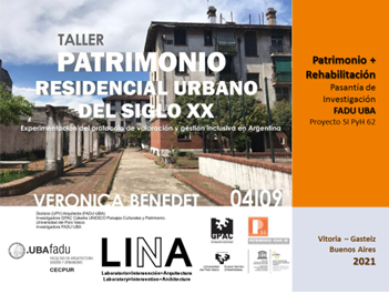 Desde hace varios años la Dra. Benedet viene vinculándose con profesionales en diferentes grupos de trabajo en la ciudad de Buenos Aires. Desde el 2021, viene realizando el “Taller Patrimonio Residencial Urbanos del SXX” dentro del marco de la Pasantía de Investigación FADU-UBA Proyecto SI PyH 62 Patrimonio + Rehabilitación. Esta pasantía es organizada por la Facultad de Arquitectura, Diseño y Urbanismo de la Universidad de Buenos Aires y la plataforma LINA y dirigida por la arquitecta Carolina Quiroga y coordinada por el arquitecto Juan Alonso. Este año 2022 se volverá a repetir la experiencia con el alumnado de la Pasantía.
